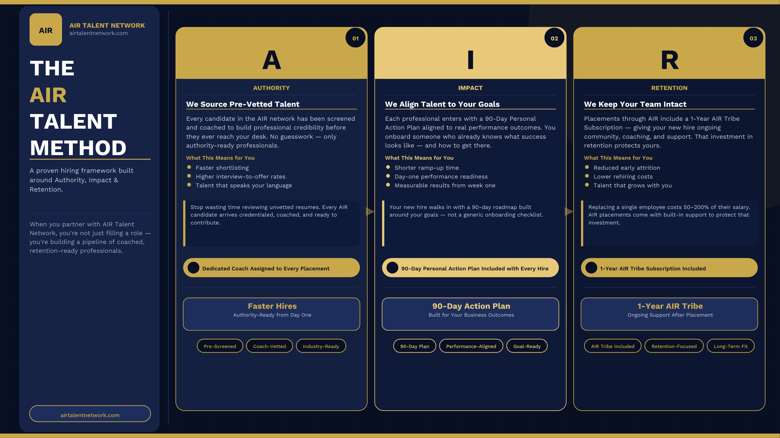 Every placement AIR Talent Network makes is grounded in three performance pillars that guide both candidate readiness and client outcomes.